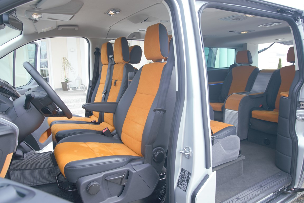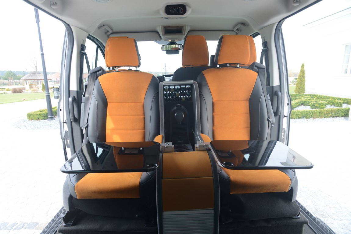 Our company has designed and created the interior for Ford Tourneo Custom. We used a new, bold colors upholstery and materials of high quality. We equipped interior with four comfortable adjustable seats, four Independent tables, fridge, coffee machine and a large trunk. Additionally, we added electrically operated sliding doors with a platform for easy to get on and out and automatically opens the trunk lid.